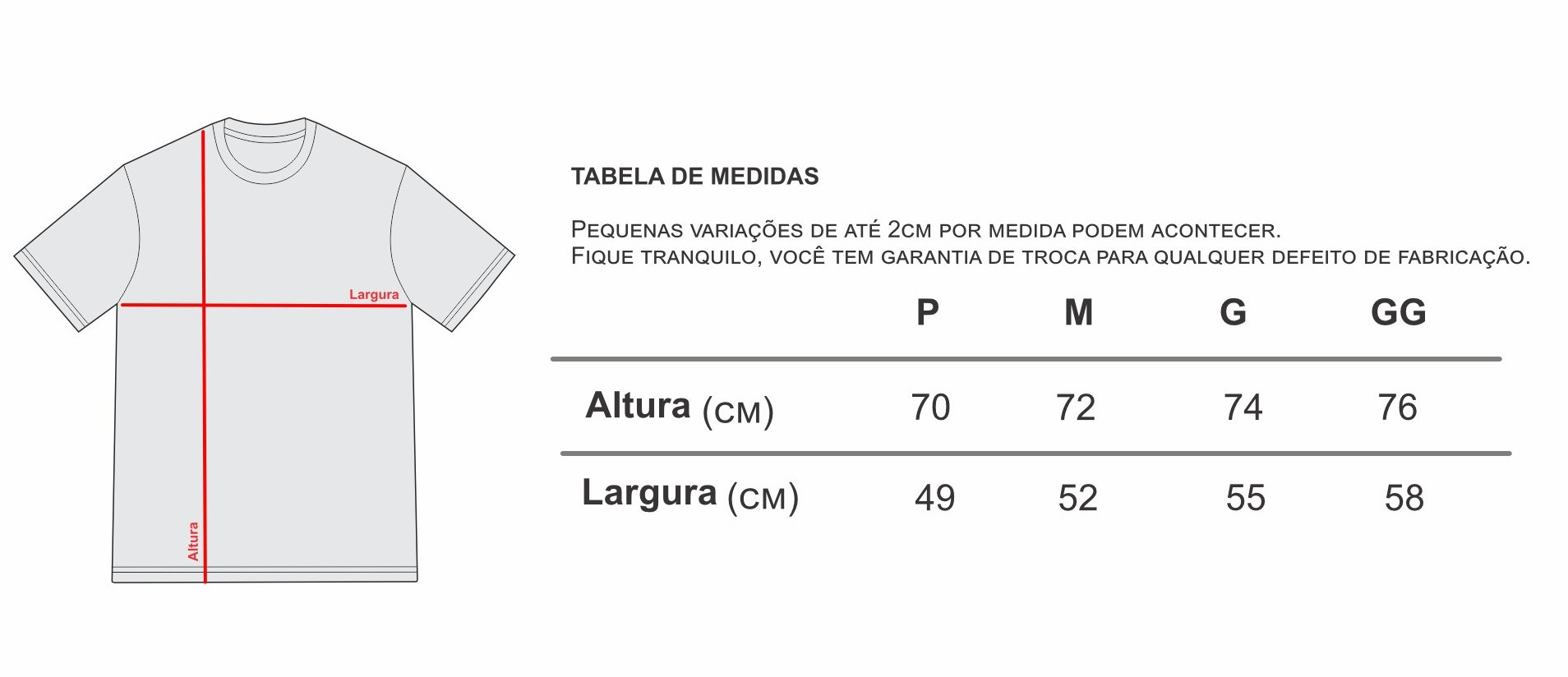 Para escolher o seu tamanho, considere que as nossas camisetas têm modelo slim. Por isso, na dúvida, compre um tamanho maior. E confira também o tamanho do modelo da foto, que veste tamanho M.